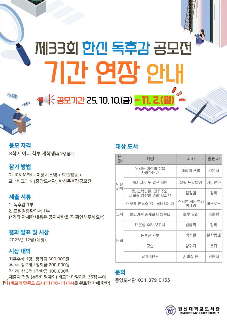 중앙도서관에서는 다음과 같이 제33회 한신 독후감 공모전 기간연장을 안내드리오니 많은 관심과 참여 바랍니다.