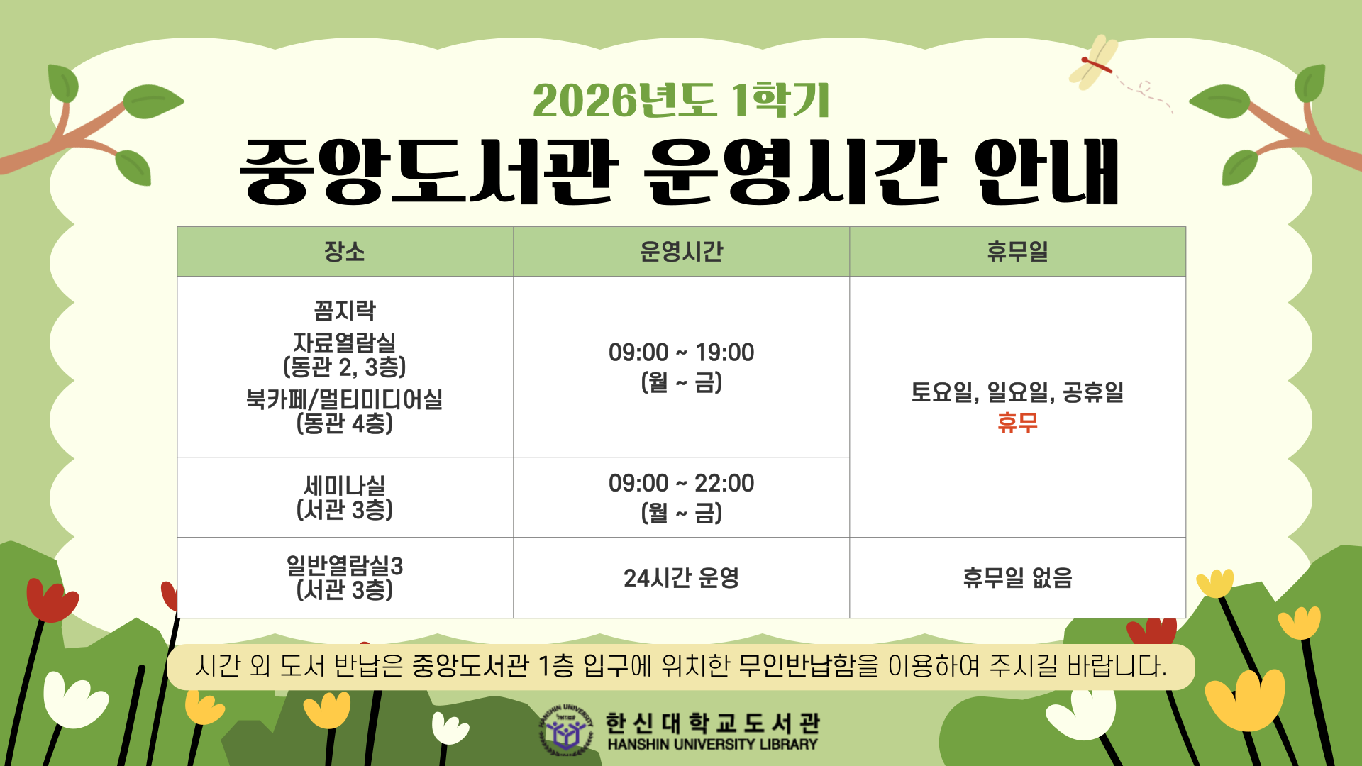 2026-1학기 한신대학교 중앙도서관 운영시간 안내